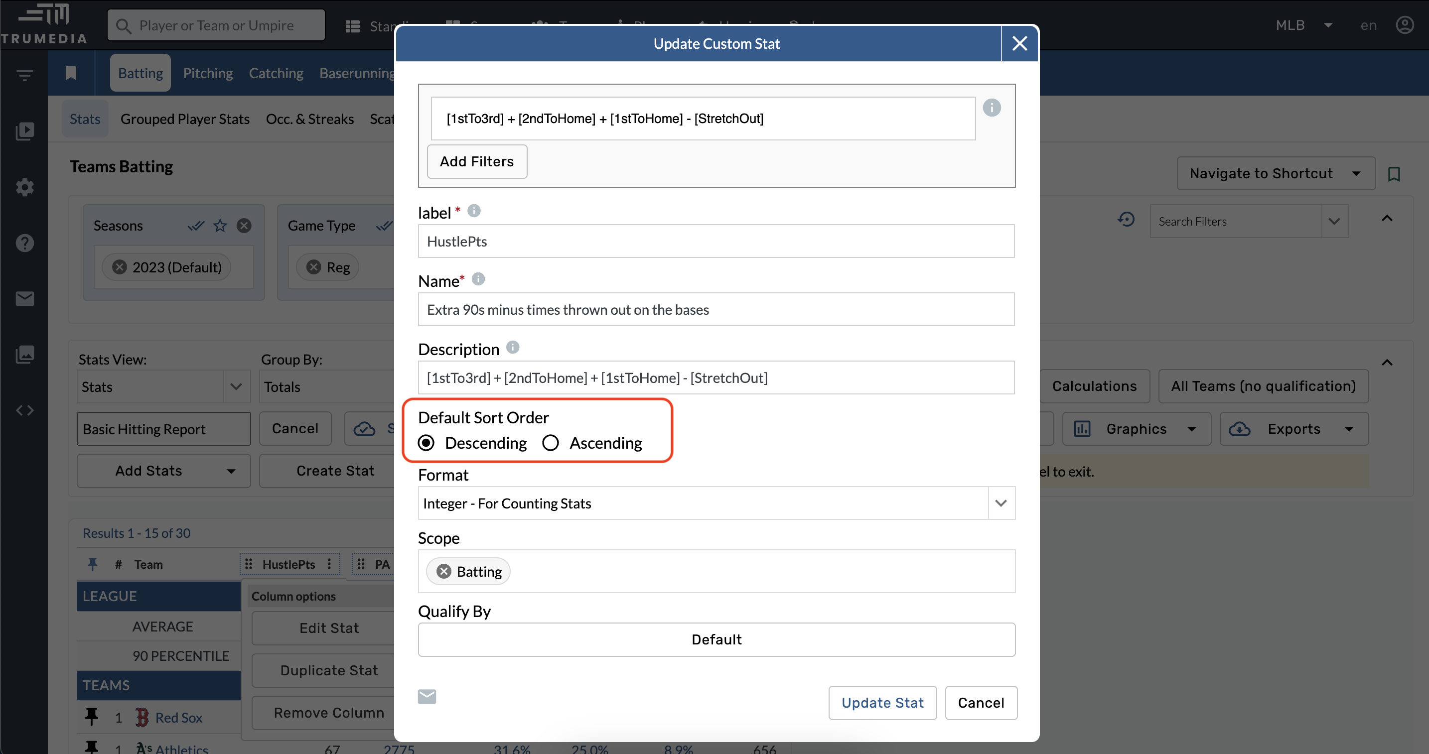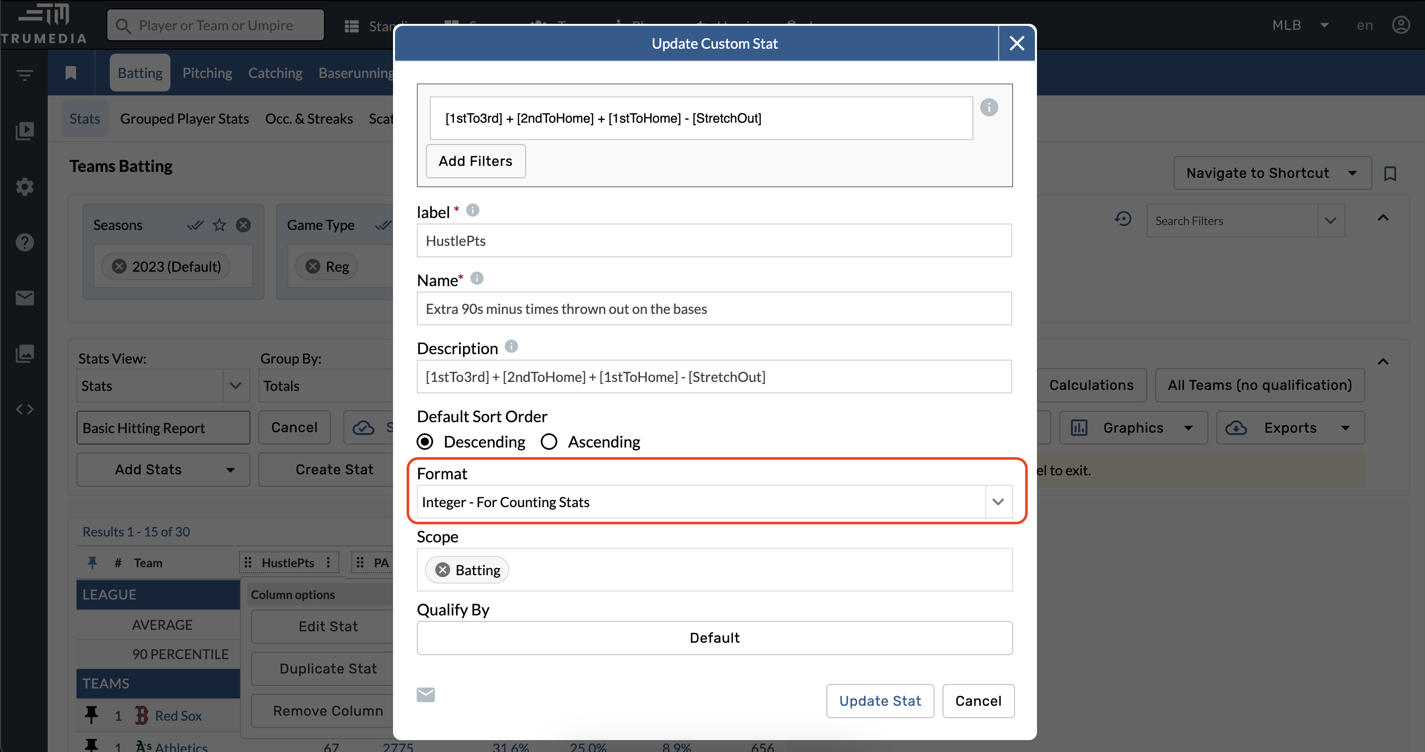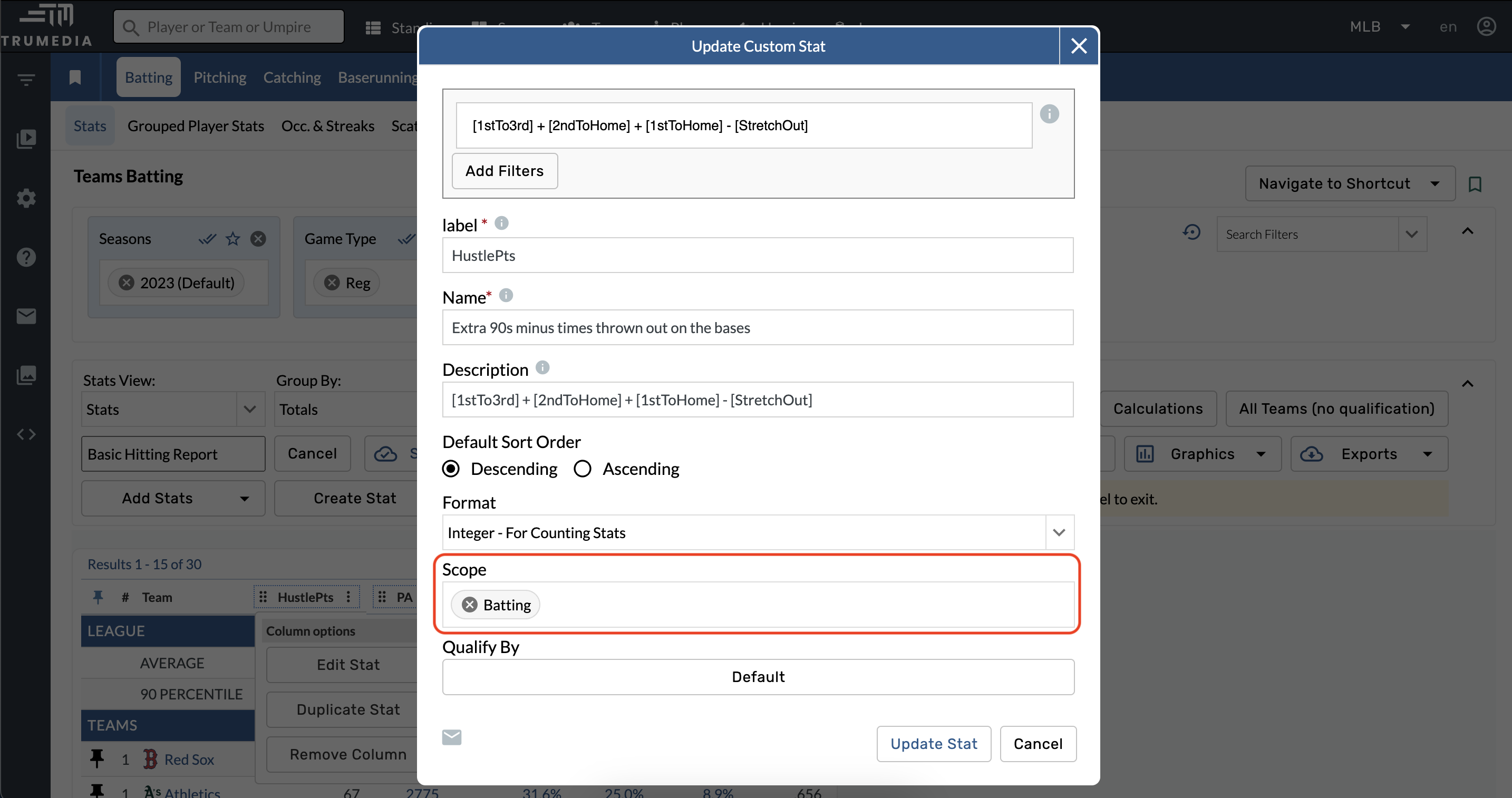 Each aspect of the game (hitting, pitching, etc.) is consider a unique scope in TruMedia. This selection of determines which reports this new stat is available to add on.