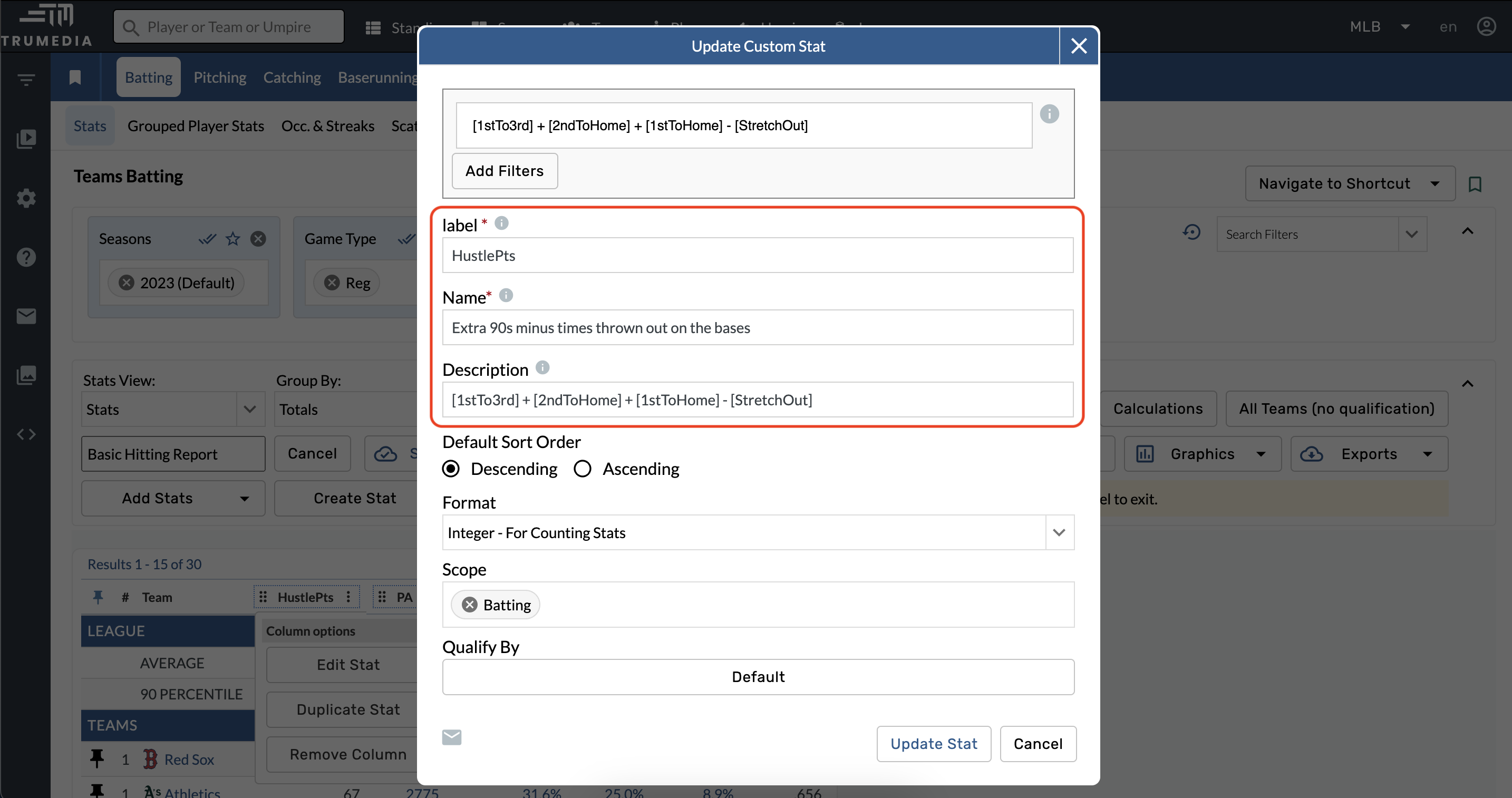 Choose a label to identify the new stat in tables and use the name and description options to provide more context in the tooltips and glossary.