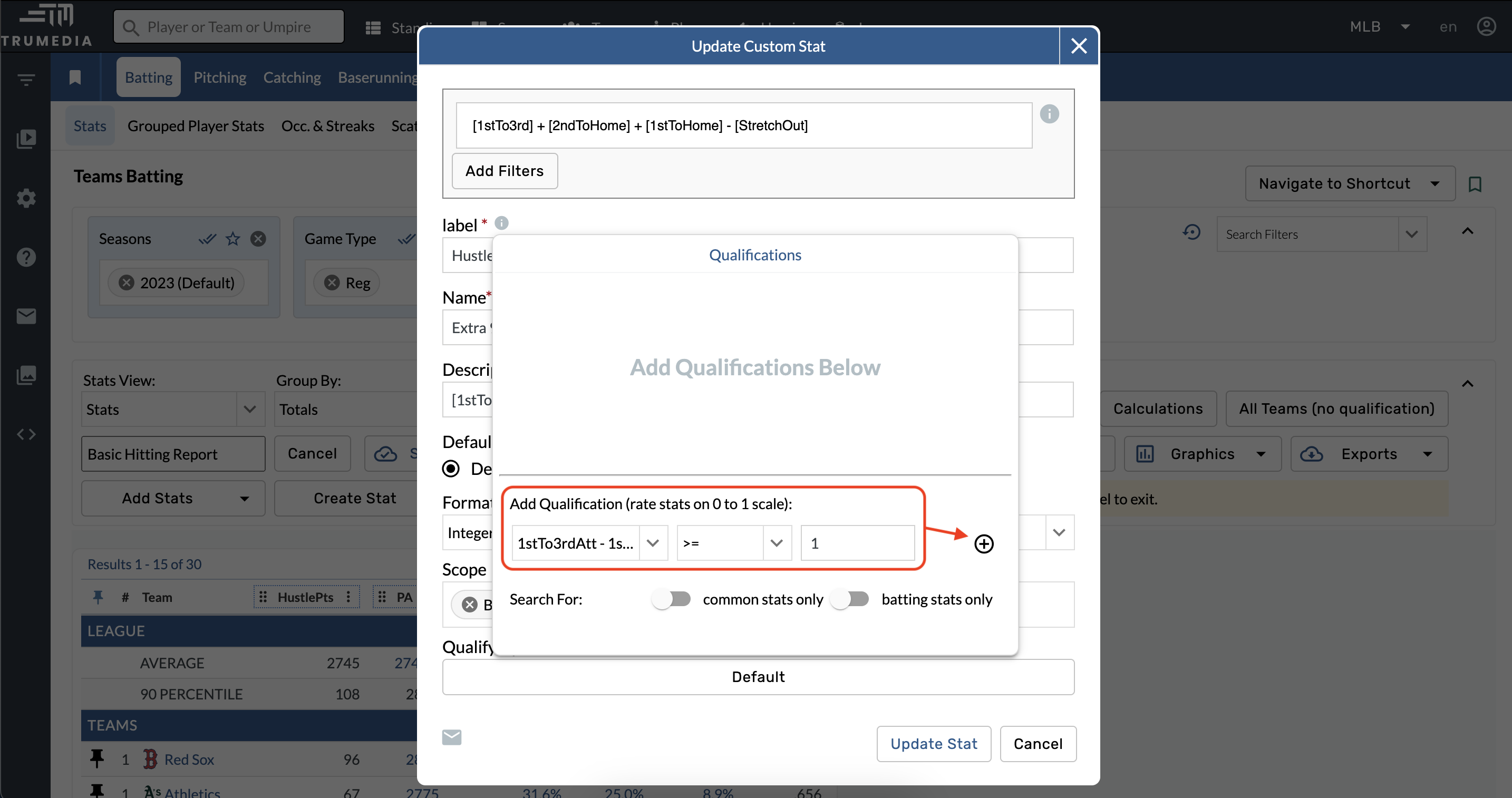 This stat example below is set to qualify any player that had one or more opportunities to go first to third on a single.