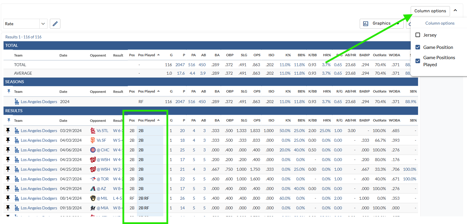 Column Options added to Player Game Log with Game Position and Game Positions Played options