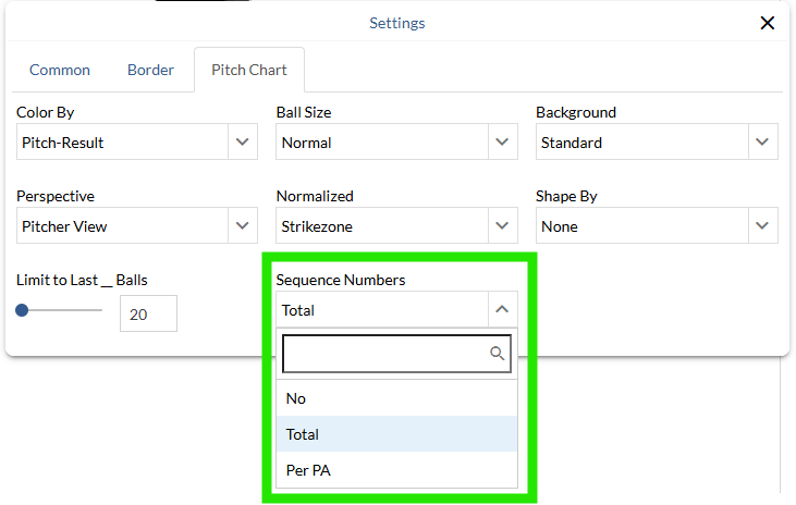 Pitch sequence numbers (Total or Per PA) can now be displayed on balls on pitch charts on custom pages.