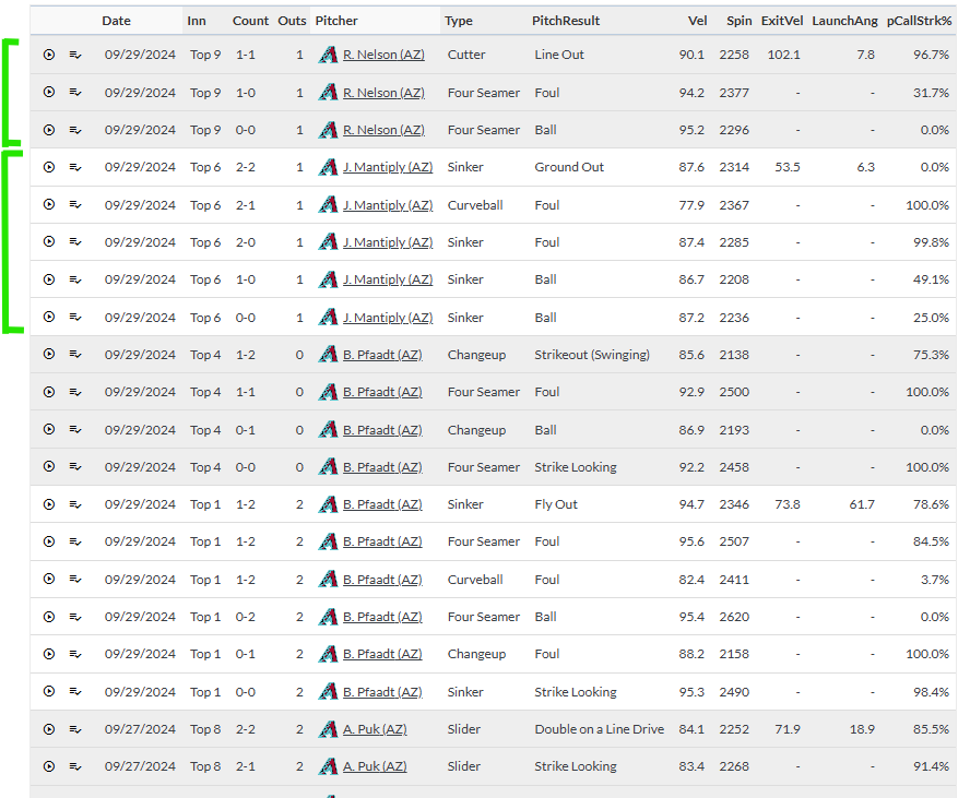A new Color by PA control has been added to pitch log tables on custom pages. When enabled, pitches in the pitch log table are now displayed with alternating gray and white coloring by plate appearance, making it easier to visually separate and distinguish each plate appearance.