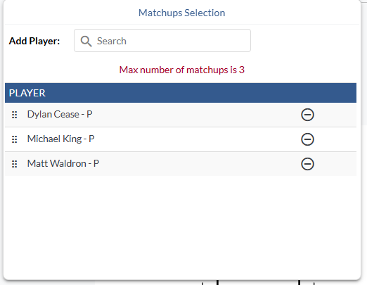 To reduce loading times on Matchups layouts on custom pages, we’re now limiting opposing pitcher/batter selection to three players on the team level. Users will have to manually search + select these players and will be notified once the 3 player limit has been reached.