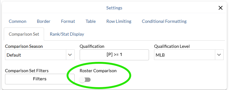 A Roster Comparison toggle has been added to Roster/Squad Tables on Custom Pages for all sports. Enabled, the comparison set will consist of the players in the table (not the team itself).
