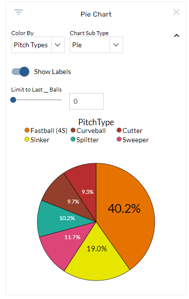 This graphic shows how many swings with a certain launch angle that an individual team or player has taken. The bins on this chart can be colored by several options such as Exit Velocity, and there are two bin sizes available: 5 degrees and 10 degrees.